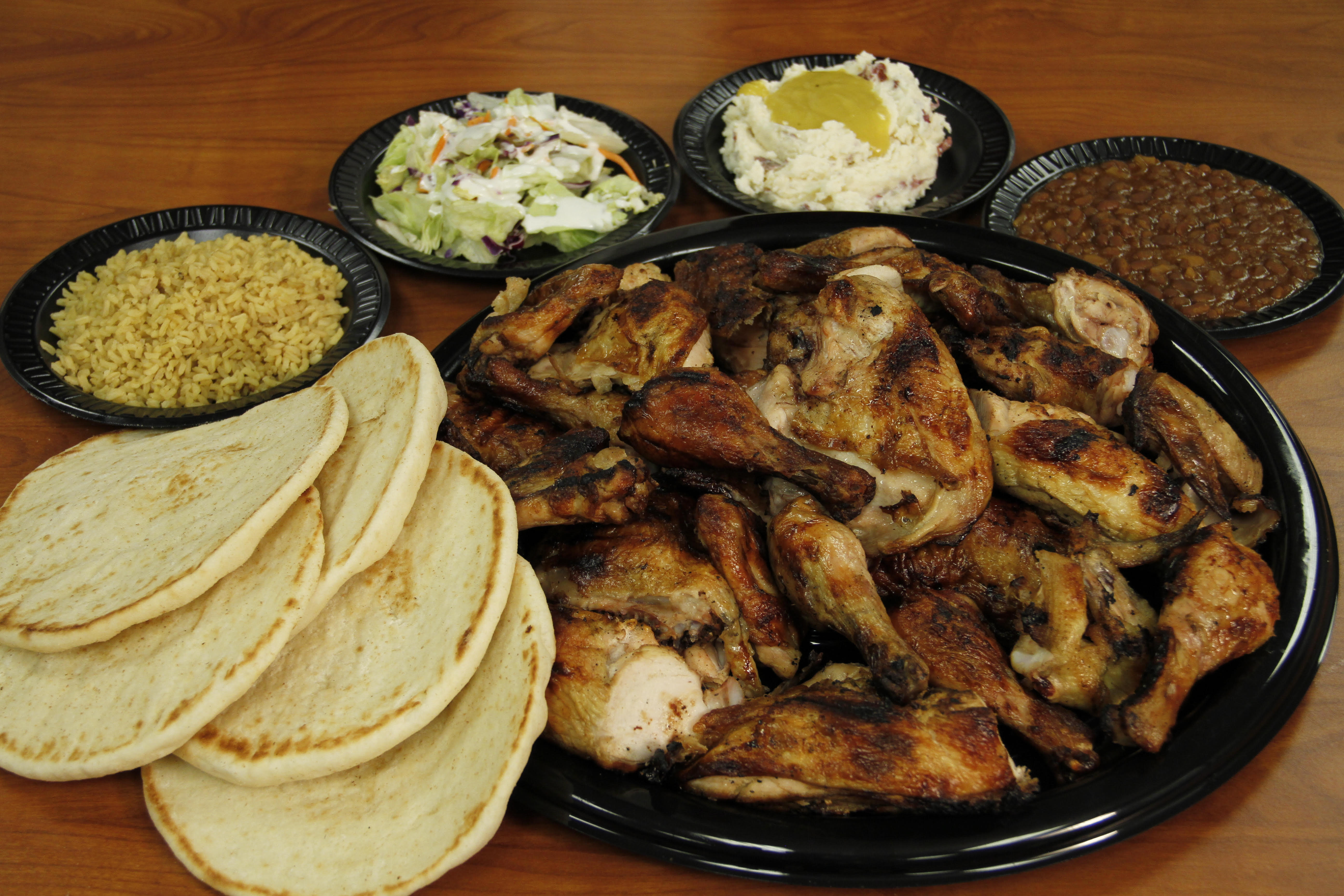 Mixed chicken pieces (white & dark), two sides & pita bread w/honey butter.
